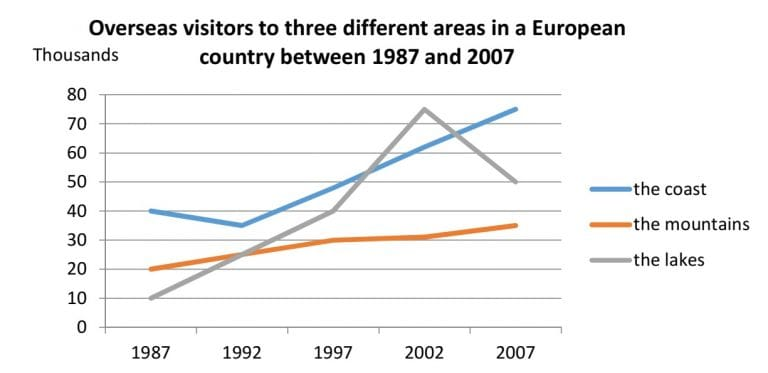 1. The graph below shows the number of overseas visitors to three different areas in a European country between 1987 and 2007.