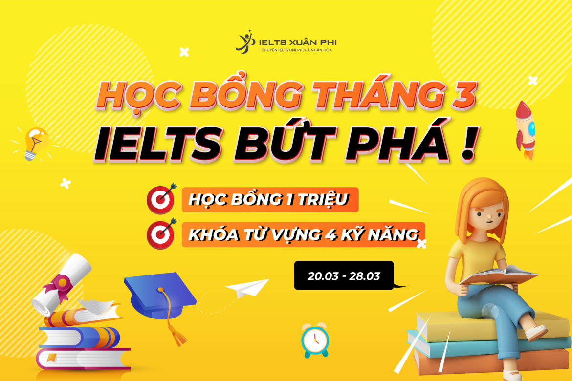 Chính vì vậy, IELTS Xuân Phi quyết định triển khai chương trình “HỌC BỔNG THÁNG 3 – IELTS BỨT PHÁ” để có thể đồng hành và hỗ trợ các bạn. Cụ thể khi các bạn đăng ký khóa học tiêu chuẩn bất kỳ tại IELTS Xuân Phi sẽ nhận được: