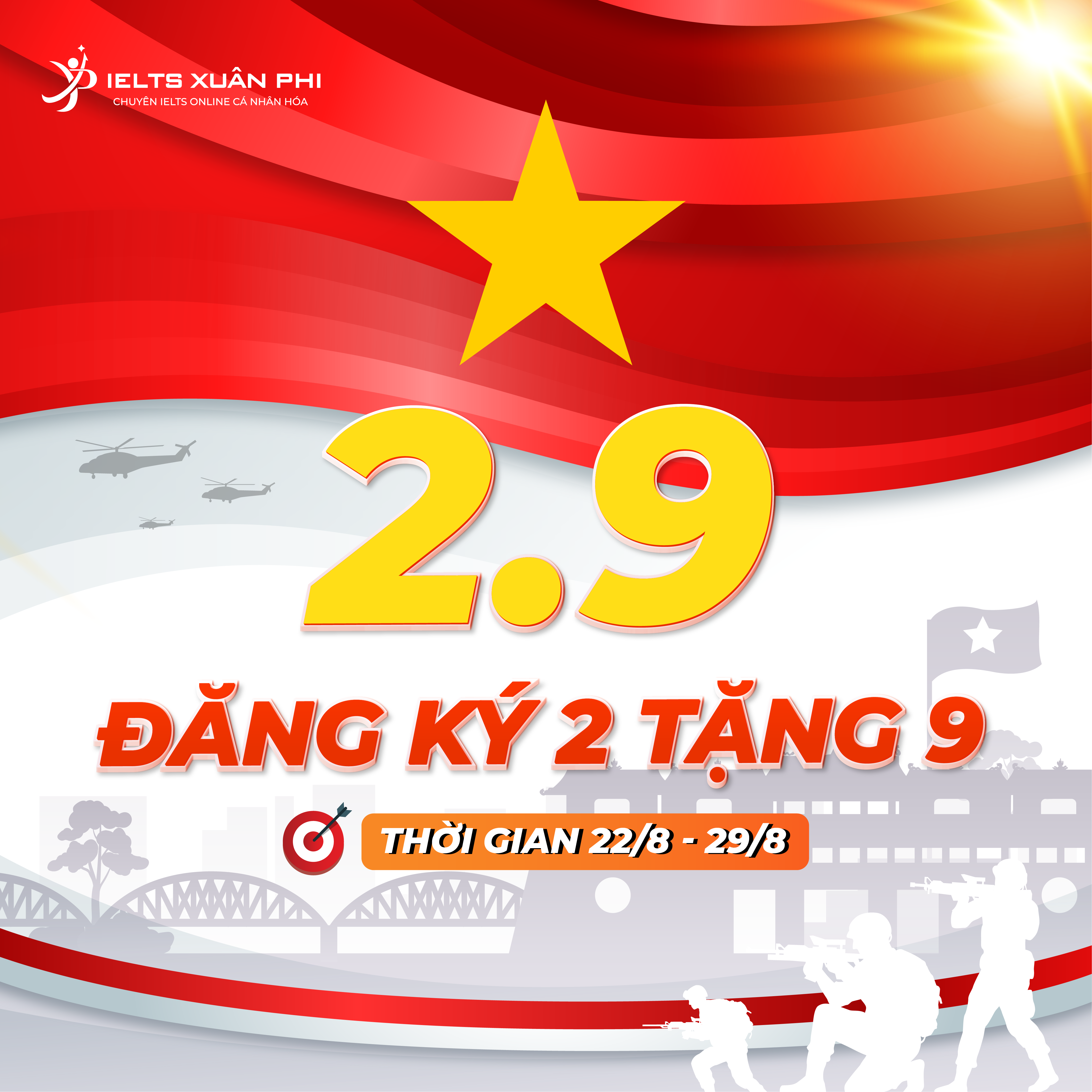 80 năm kỷ niệm ngày khai sinh ra nước Việt Nam độc lập – một dấu son đầy tự hào. Nhân dịp đại lễ lớn 2/9 của đất nước, IELTS Xuân Phi quyết định dành tặng các bạn phần quà vô cùng giá trị qua chương trình “Đăng ký 2, tặng 9”. Cụ thể khi đăng ký khóa học tiêu chuẩn mới bất kỳ, học viên sẽ được tặng:
